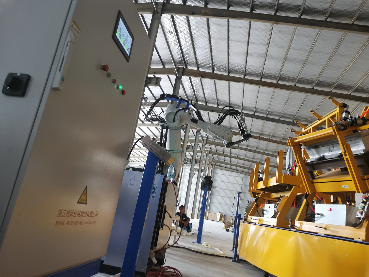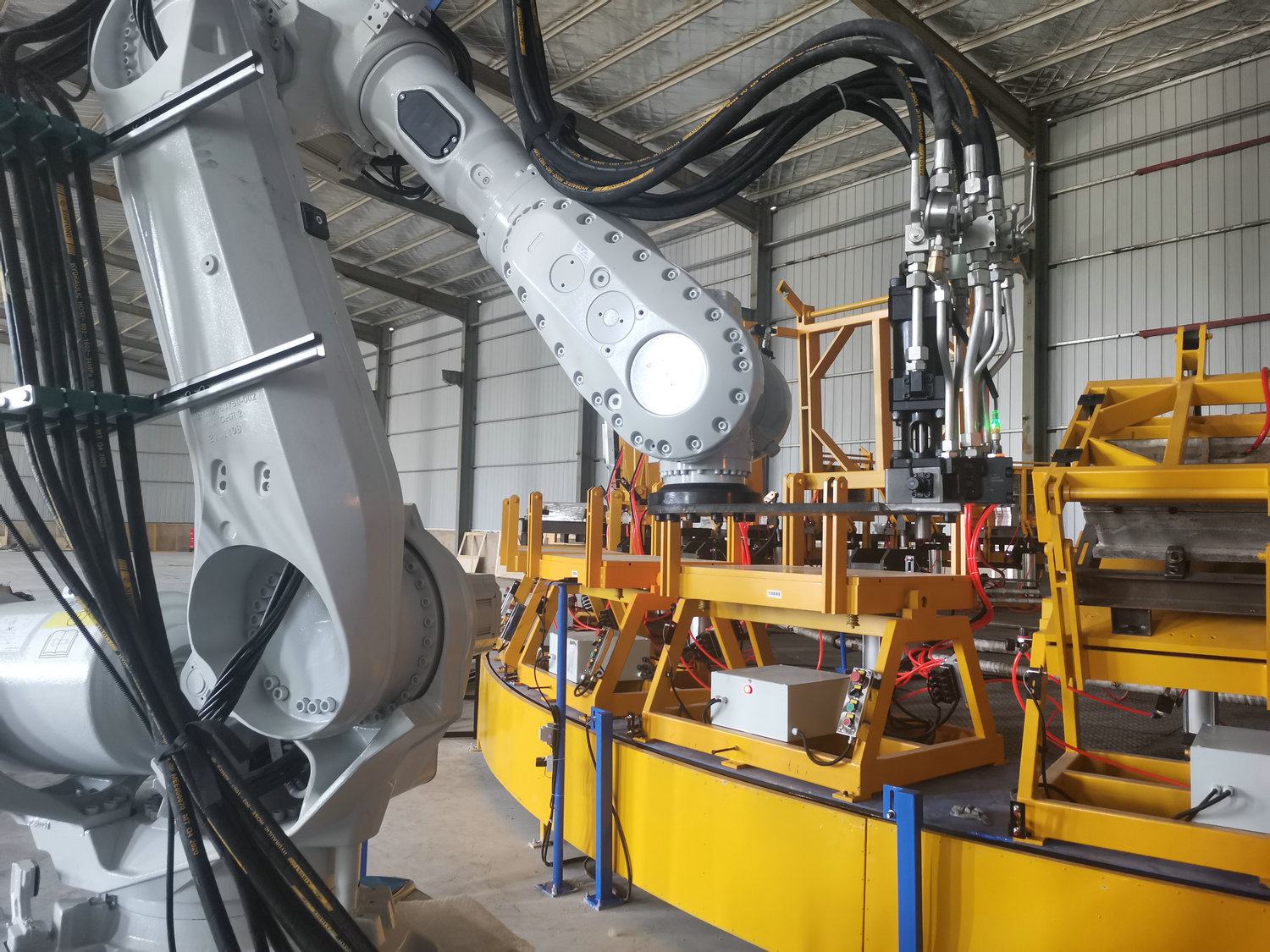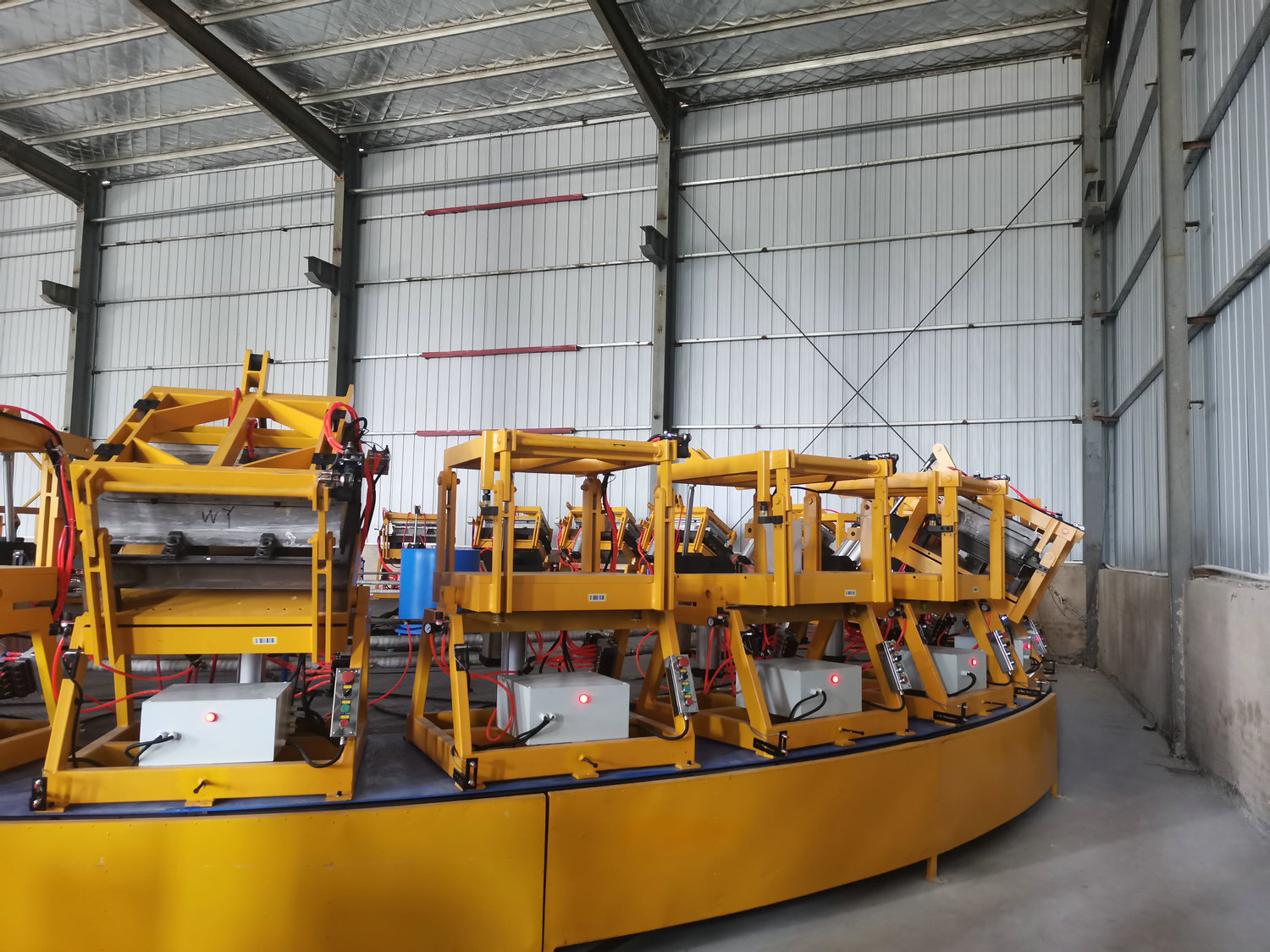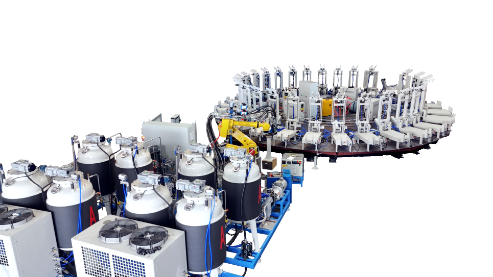 圓盤生產(chǎn)線由高壓發(fā)泡機、機械手、模架、模溫機、圓形轉(zhuǎn)盤、掃碼器、自動控制系統(tǒng)等各裝置組成